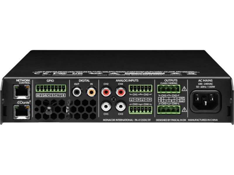 | Connections | 4 x RCA line plug-in screw terminals (mic/line) 2 x RCA (digital in/out) plug-in screw terminals GPIO plug-in screw terminals speakers 1 x RJ45 network connection 1 x RJ45 Dante® |