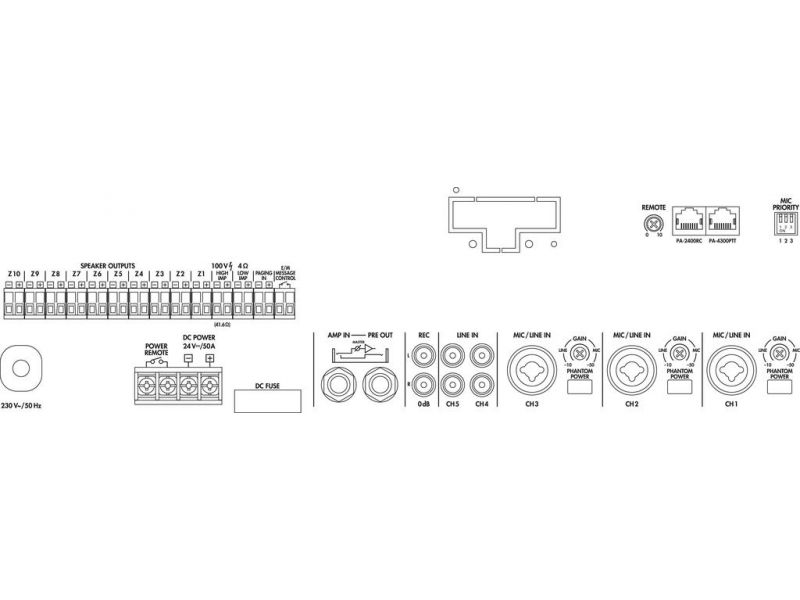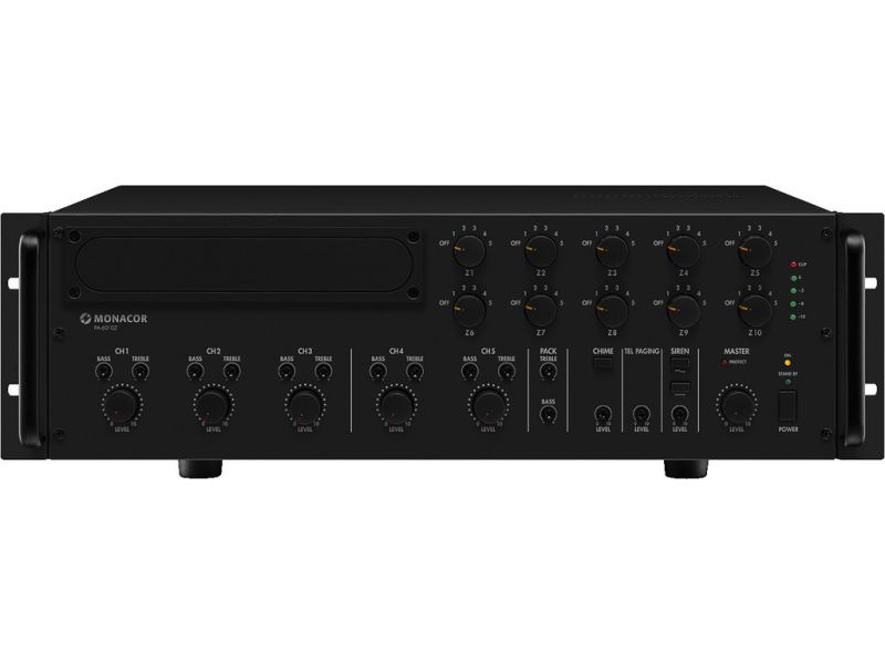 10-zone mono PA mixing amplifier 1 x 600 W 10 zones, can be controlled individually 3 inputs microphone/line via comb. jacks 2 inputs stereo line via RCA jacks Additional 60 W amplifier for separate announcements via zone paging microphone PA-2400RC...