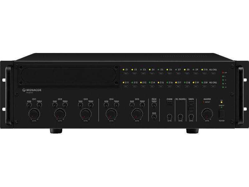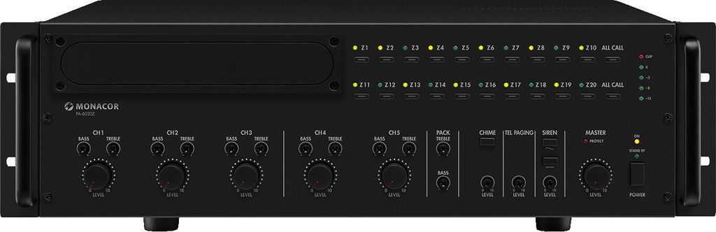 20-zone mono PA mixing amplifier 1 x 600 W 20 zones, can be controlled individually 3 inputs microphone/line via comb. jacks 2 inputs stereo line via RCA jacks Chime, continuous sound and wailing sound, automatic mute, 2-tone chime or 4-tone chime (...