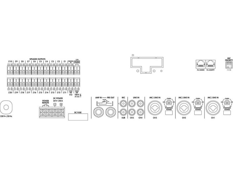 | Connections | 3 x combo 6.3 mm/XLR (mic/line), 2 x RCA L/R (line), 1 x 6.3 mm jack (preamplfier input), 1 x RJ45 (push-to-talk mic), 1 x RJ45 (zone paging mic), 1 x RCA L/R (record output), 1 x 6.3 mm jack (preamplifier output), screw contacts (chime button), screw contacts (speakers) |