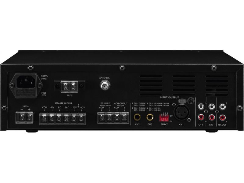 | Connections | 1 x XLR (channel 1), 2 x 6.3 mm jack (channels 2-3), 2 x RCA L/R (channels 4-5), 2 x RCA (record out), 1 x F jack (FM/DAB+), screw contacts (tel. input), screw contacts (MOH), screw contacts ( DC 24 V), screw contacts (mute), screw contacts (speakers) |