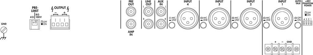 | Connections | 4 x XLR (mic/line), 1 x RCA L/R (aux), screw contacts (speakers) |