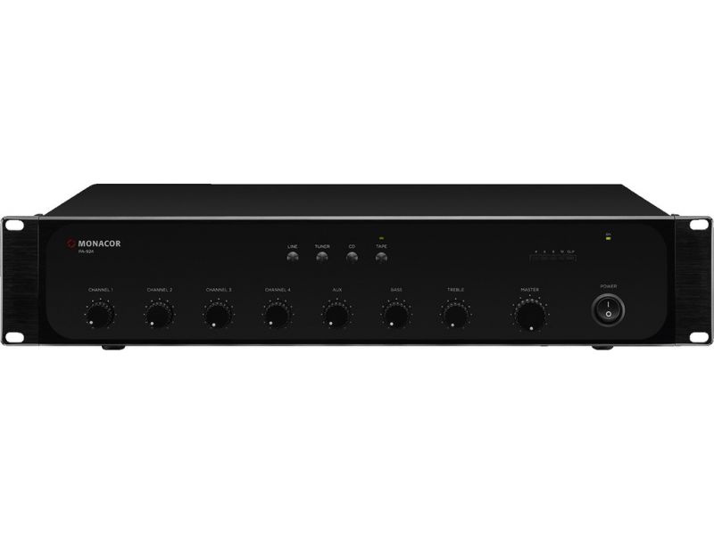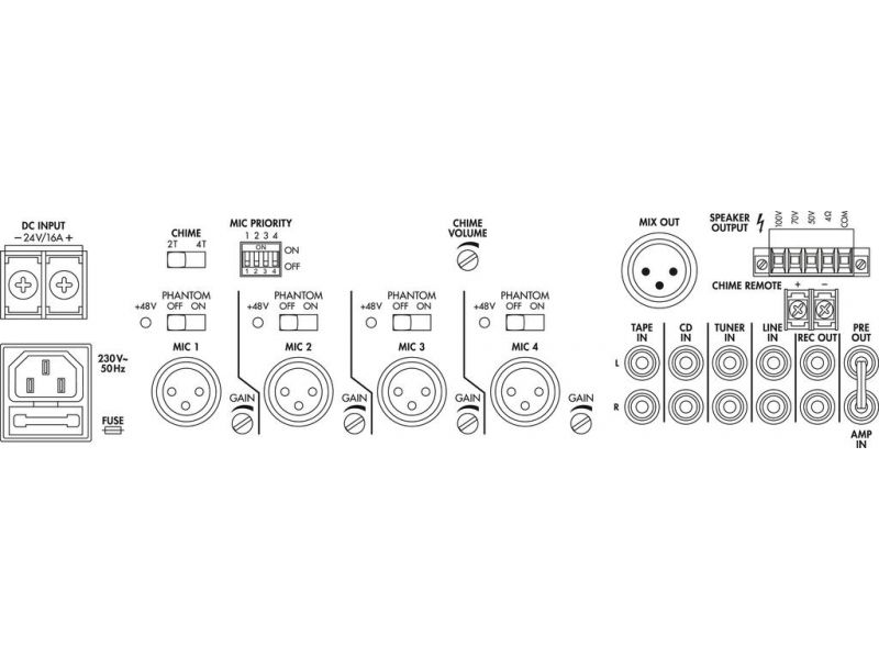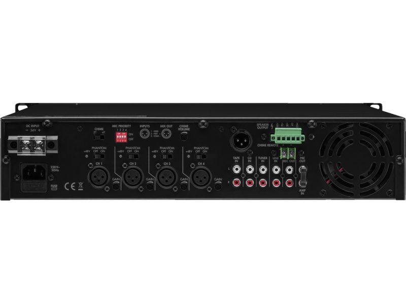 Mono PA mixing amplifier 1 x 240 W 4 balanced microphone inputs and line inputs with selectable priority 4 stereo line inputs Speaker outputs via screw terminal contacts Balanced line output Record output Insert facility, e.g. for effect units, equa...