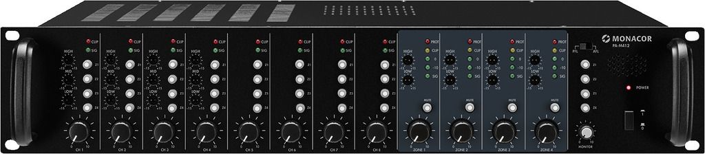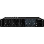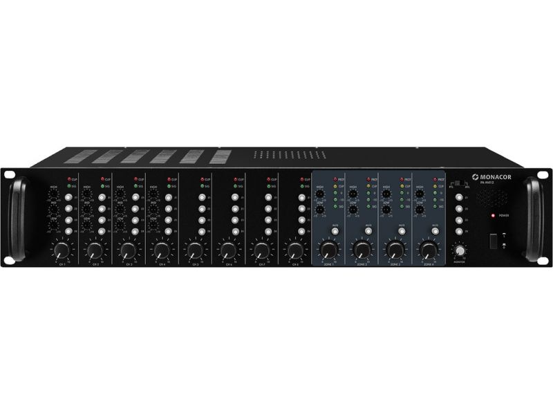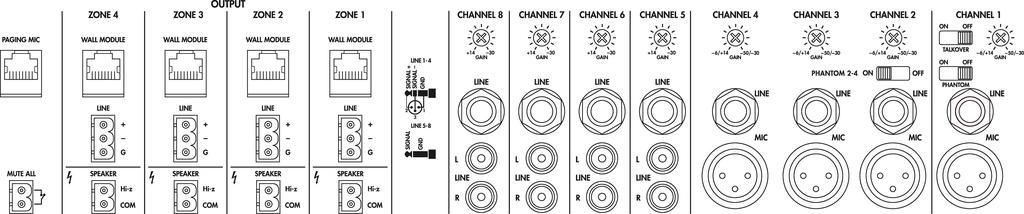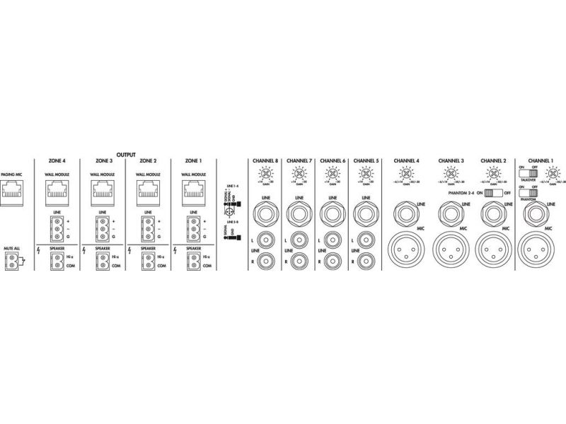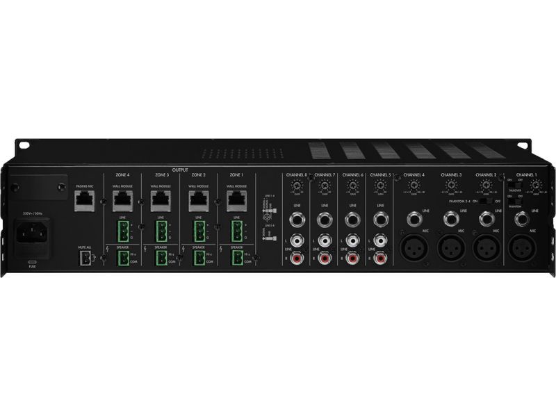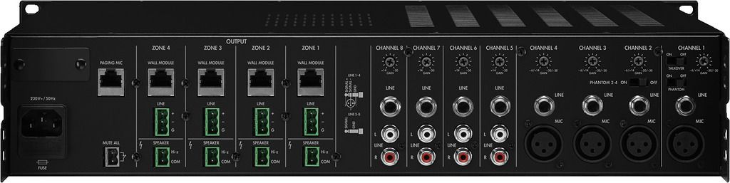 | Connections | 4 x XLR, bal. (mic 1-4), 4 x 6.3 mm jack (line 1-4), 4 x 6.3 mm jack (line 5-8), 4 x RCA L/R (line 5-8), 1 x RJ45 (push-to-talk microphone), 4 x RJ45 (remote in), screw terminal (speakers) |