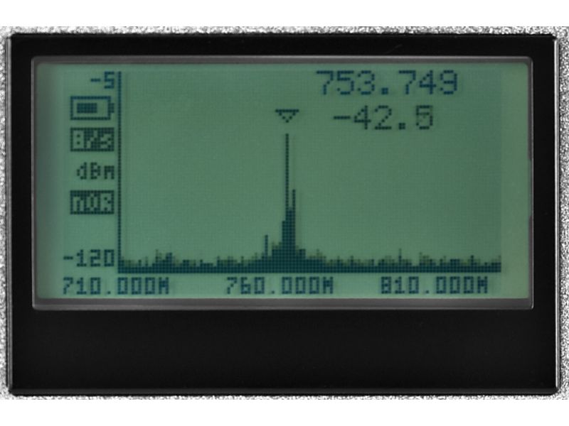 - Real-time monitoring of the frequency range used with indication of frequency and level (dBm and dBµV)