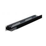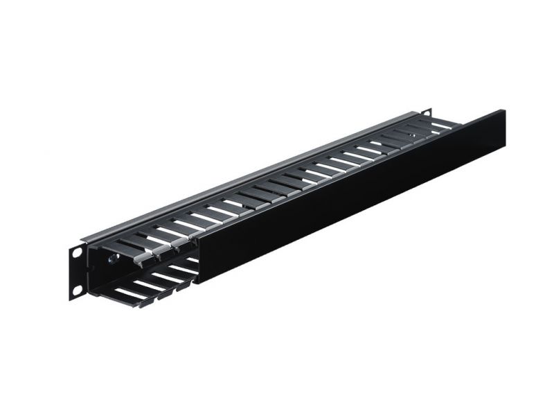 Rack-mount cable duct, 1 RU for horizontal cable management in 482 mm (19") racks, e.g. RACK-42NV, RACK-33NV, RACK-21NV, RACK-15NV. Metal rack panel, black powder-coated (standard RAL 9005) Panels with oval apertures for cable routing from the fron...