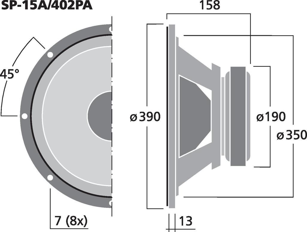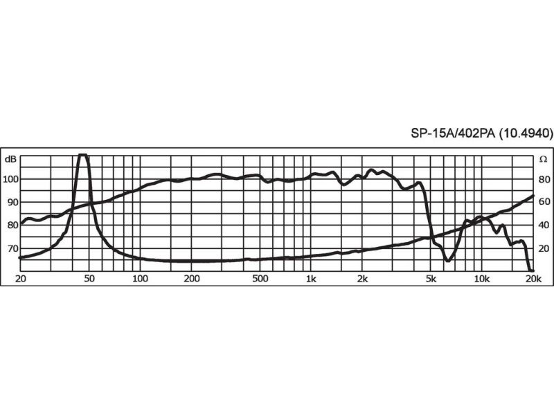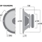 PA bass speaker, 400 W, 8 Ω Of very high power capability 38 cm (15") professional bass speaker of long excursion Diecast basket Cone with water-repellent coating Very neat workmanship with front-facing basket Wide frequency response High efficiency...
