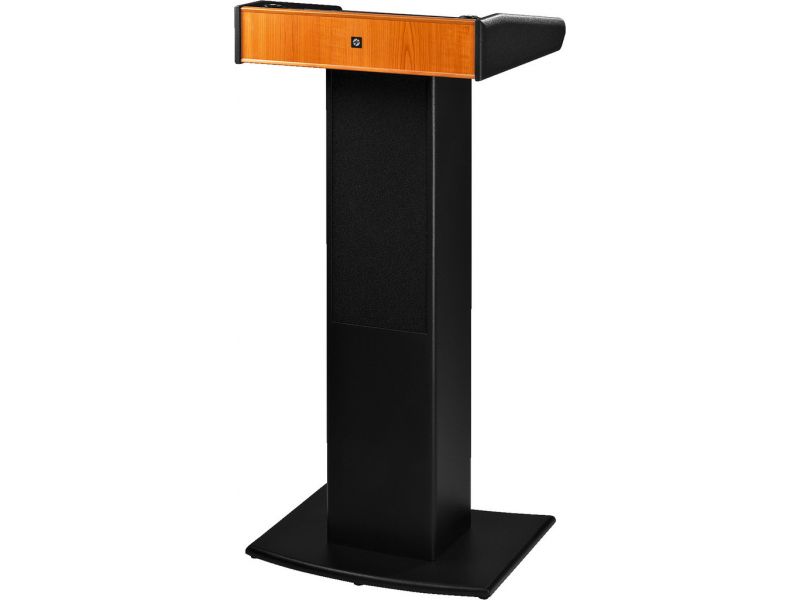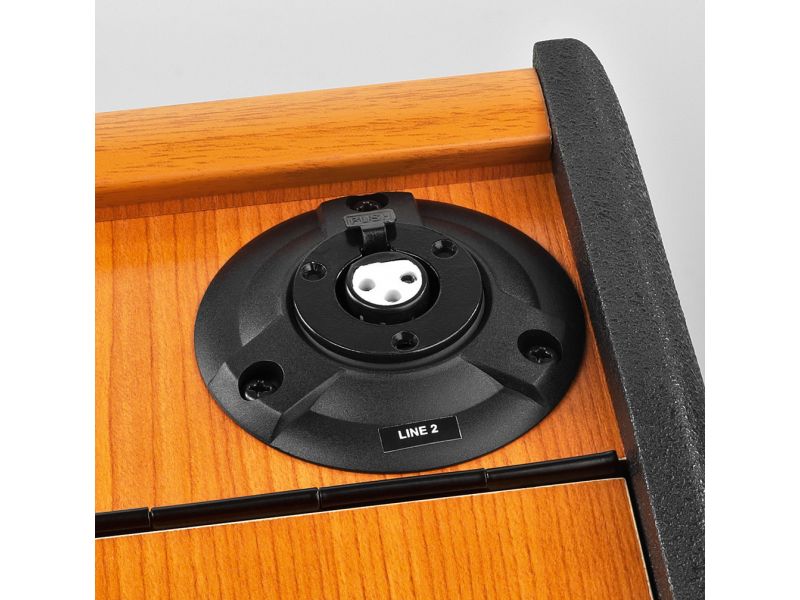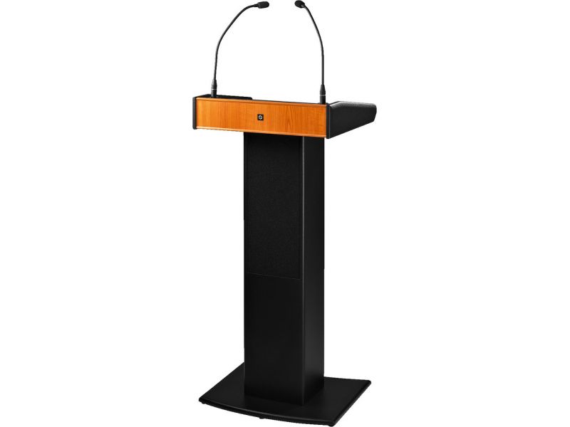 - 2 shock-absorbing XLR jacks on the top part of the lectern for 2 optional gooseneck microphones (use one microphone input each) or one microphone and one optional LED gooseneck light