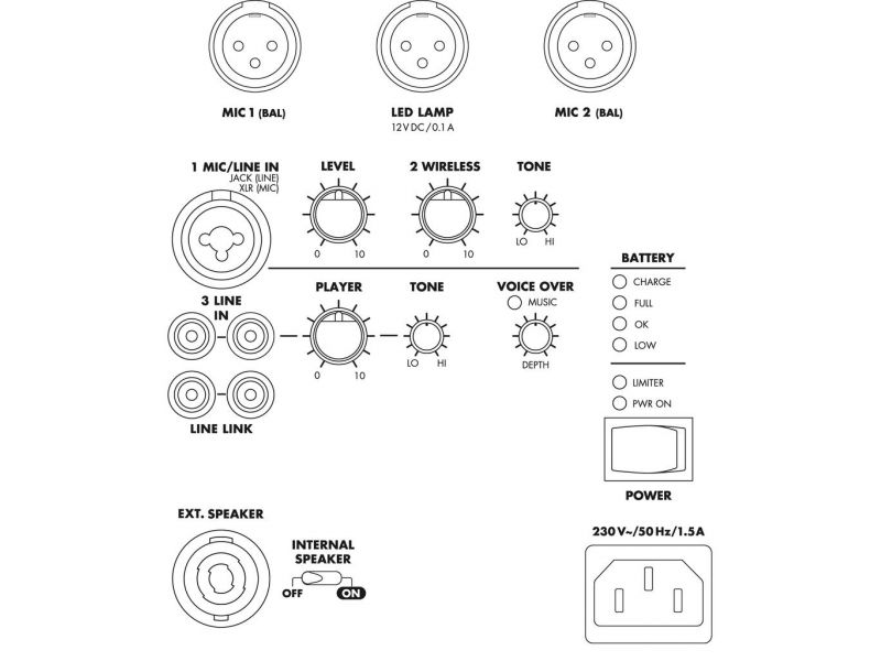 The integrated amplifier technology and speaker technology not only allow for voice transmissions but can also easily be used for music reproductions and e.g. dubbings of films or presentations with quite good results. Simply plug in a gooseneck microphone and/or connect a signal source - switch on - ready to use.