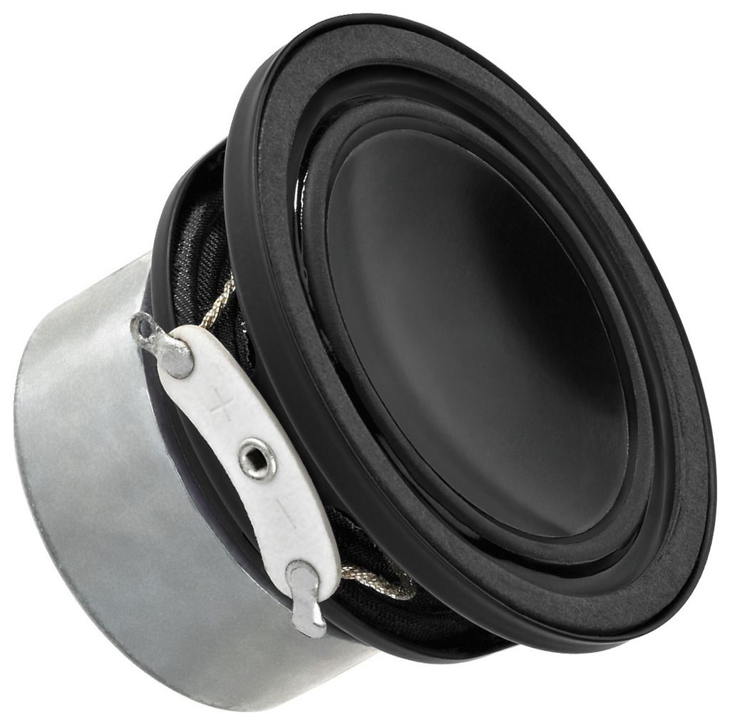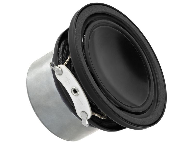 Miniature hi-fi full range speaker, 15 W, 8 Ω Round steel basket with rear-ventilated centering spider Adhesive mounting or clamp mounting Inverse laminated cone Efficient neodymium drive system Perfect full range reproduction with an excellent effic...