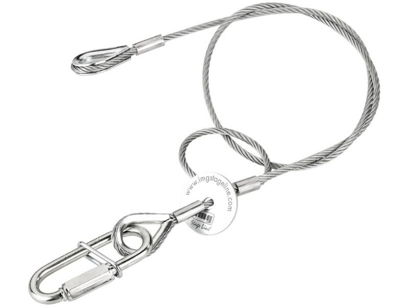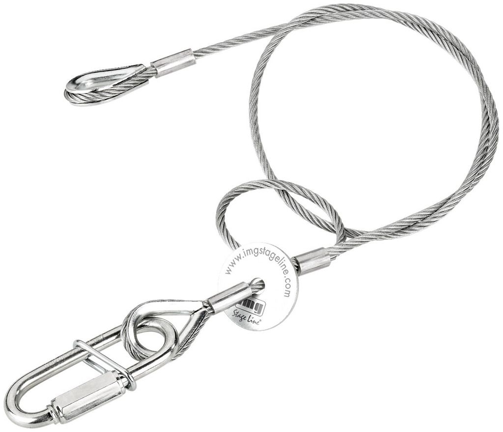 Safety rope, for speaker systems in suspended installation. Saveking® Certified according to BGV-C1 Length: 60 cm, diameter: 3 mm Quick link for safety ropes (complies with DIN 56926) For devices with a weight of up to 20 kg (single-stranded), up t...