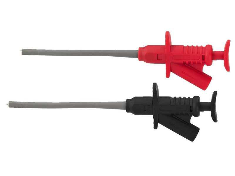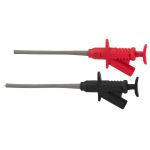 Pair of clamp-type test prods 5 A, for pushing onto the safety test leads of the TLP-... series. Colour: red and black Flexible shaft Telescopic spring wire hooks According to CAT II (1,000 V) All-insulated due to covered plug-in contacts, Ø 4 mm T...